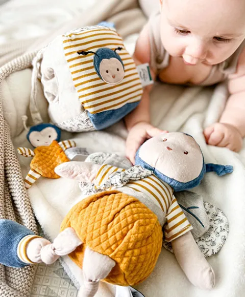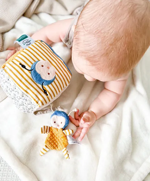 POLLEN est une charmante abeille, tout en coton bio rembourrée de fibres polyester 100% recyclées. Optez pour ce cube d’activités spécialement conçu pour éveiller les sens de votre petit bout grâce aux différentes couleurs et textures.