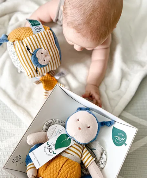Les matières organiques utilisées pour ce jouet ont été choisies méticuleusement pour éveiller les sens des enfants. Ce cube d’éveil en tissu a été travaillé avec soin pour être facile à manipuler et répondre à tous les besoins des bébés.