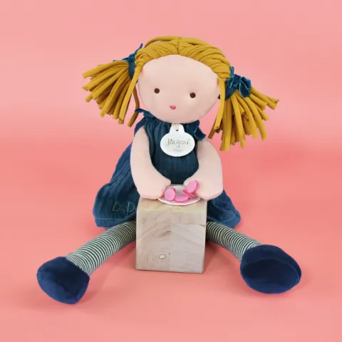 LES DOUCETTES, douces et mignonnes, bohèmes et chic, elles aiment prendre du bon temps, vivre en collectivité et partager de belles histoires. Jade, une doucette attentionnée et spontanée, qui porte une jolie robe bleu canard évasée et souple en lange de coton, collants rayés, ballerines et cheveux blonds coiffés en couettes, elle aime rire entre amis.