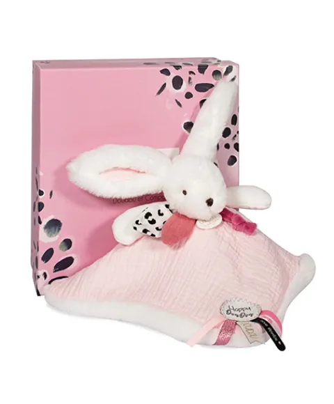 Le doudou plat avec coffret lapin rose pastel « Happy Blush » est un adorable cadeau pour les tout-petits ! Doux et coloré, ce petit lapin deviendra vite son compagnon préféré. Stylé, tendance « mix and match », avec son pompon couleur bouton de rose, garni de touches de lange en camaïeu de blush, ainsi que de passementeries fantaisies et rubans tissés savamment coordonnés, ce lapin happy pétille de fraicheur. Blotti dans une superbe boîte cadeau aux graphismes évoquant à la fois la modernité et le luxe, comme dans un écrin magique, ce doudou surprise se dévoile délicatement.