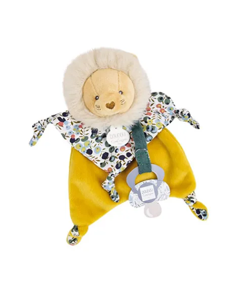 Le Doudou Attache-sucette Lion a une jolie frimousse, des matières douces combinées à de fraîches textures, une multitude de nouettes à manipuler et un imprimé exclusif signé DOUDOU ET COMPAGNIE !
