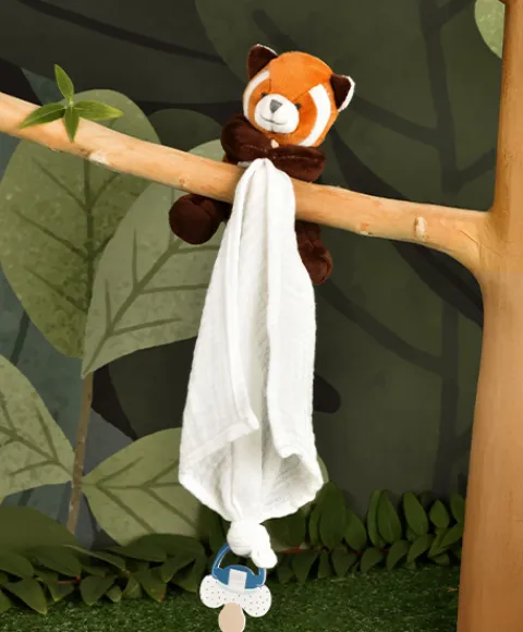 Ce petit Doudou attache-sucette panda roux, aux couleurs fauves tient dans entre ses pattes, un carré de lange souple en coton, bien pratique pour y attacher sa tétine et toujours l’avoir à portée de man. Il est présenté dans une boîte cadeau au motif végétal raffiné, une boîte tellement bien illustrée qu’elle sera conservée et upcyclée à coup sûr.