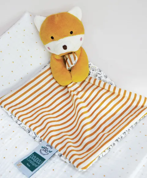 Ce Doudou Renard a été crée dans des tonalités harmonieuses rappelant subtilement la nature : la couleur jaune doré pour le soleil et la terre d’ocre, l’écru et le lin pour les fibres naturelles et une touche de bleu pour l’eau, élément vital, Ce Doudou séduit aussi par la richesse visuelle de ses imprimés.