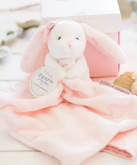 Le doudou mouchoir mini format Lapin rose est un cadeau de naissance idéal et original, tout doux pour que bébé commence à découvrir de nouvelles textures dès sa naissance, Ce mini-doudou lapin avec son petit nud à loreille est vraiment trop chou ! Une boite fleur est incluse,