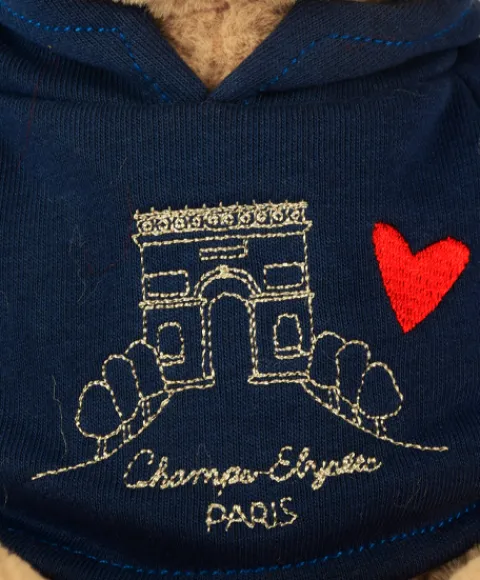 Adoptez cet ours en peluche marron, un concentré de glamour parisien ! Pull bleu marine, Arc de Triomphe brodé : un clin d’œil à l’avenue des Champs-Élysées. Un cadeau parfait, un souvenir idéal pour les amoureux de la capitale et de la France.