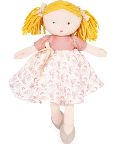 Camélia est confectionnée en coton BIO, rembourrée de fibres polyester 100% recyclées. Elle porte un t-shirt en jersey rose et une jupe en lange aux motifs végétaux blancs et roses assorti délicatement à ses petits noeuds.